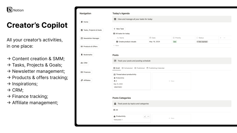 Creator Copilot Notion System is designed to help you create and plan quality content, manage products, offers, and clients, and achieve goals faster with a systematic approach.