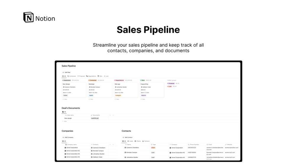 CRM Powerhouse: Supercharge your sales pipeline with intuitive features like deal tracking, contact management, and company profiles.