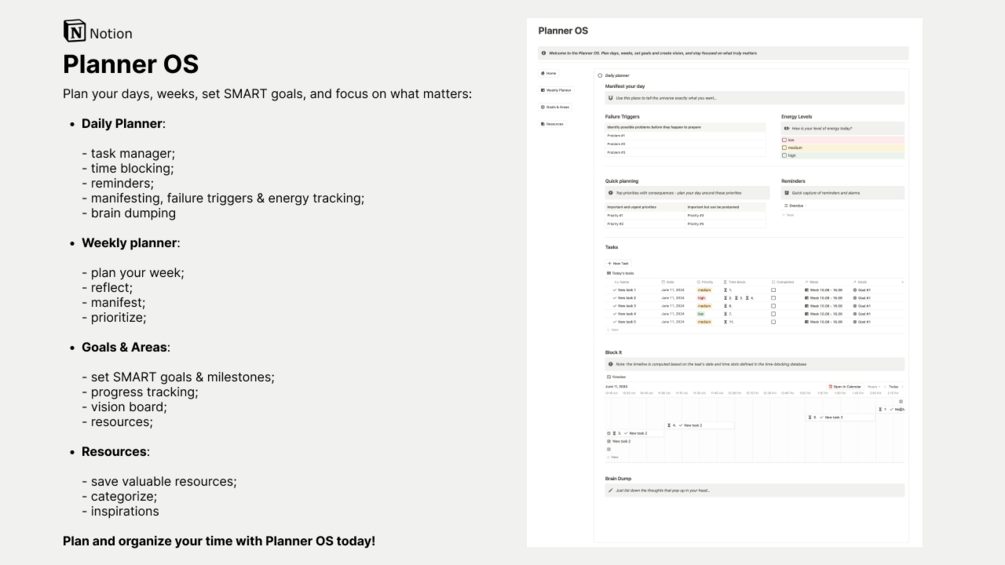 → Daily Planner: task manager, time blocking, reminders, manifesting, failure triggers & energy tracking, brain dumping;