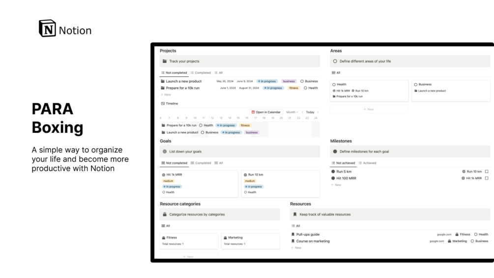 The PARA Boxing template is based on 2 productivity techniques - PARA (projects, areas, resources, archive), and Time Boxing - and offers the following functionality: