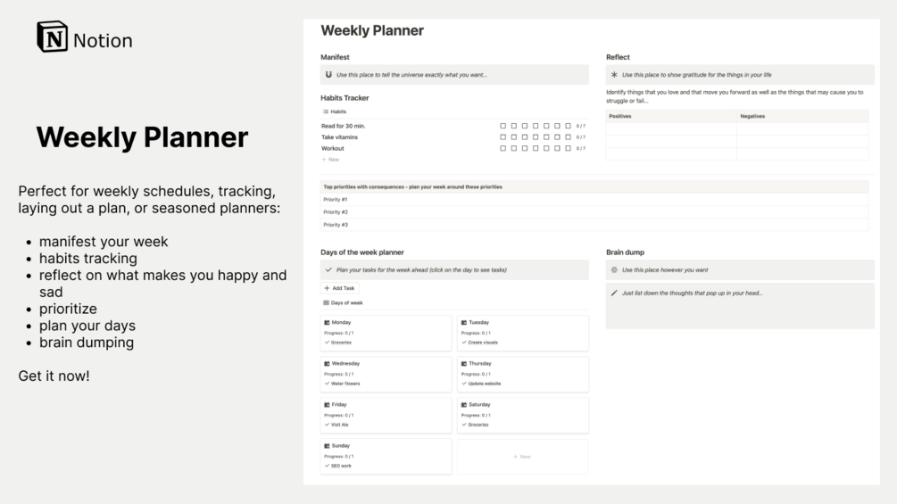 → Weekly planner: plan your week, reflect, manifest, prioritize;